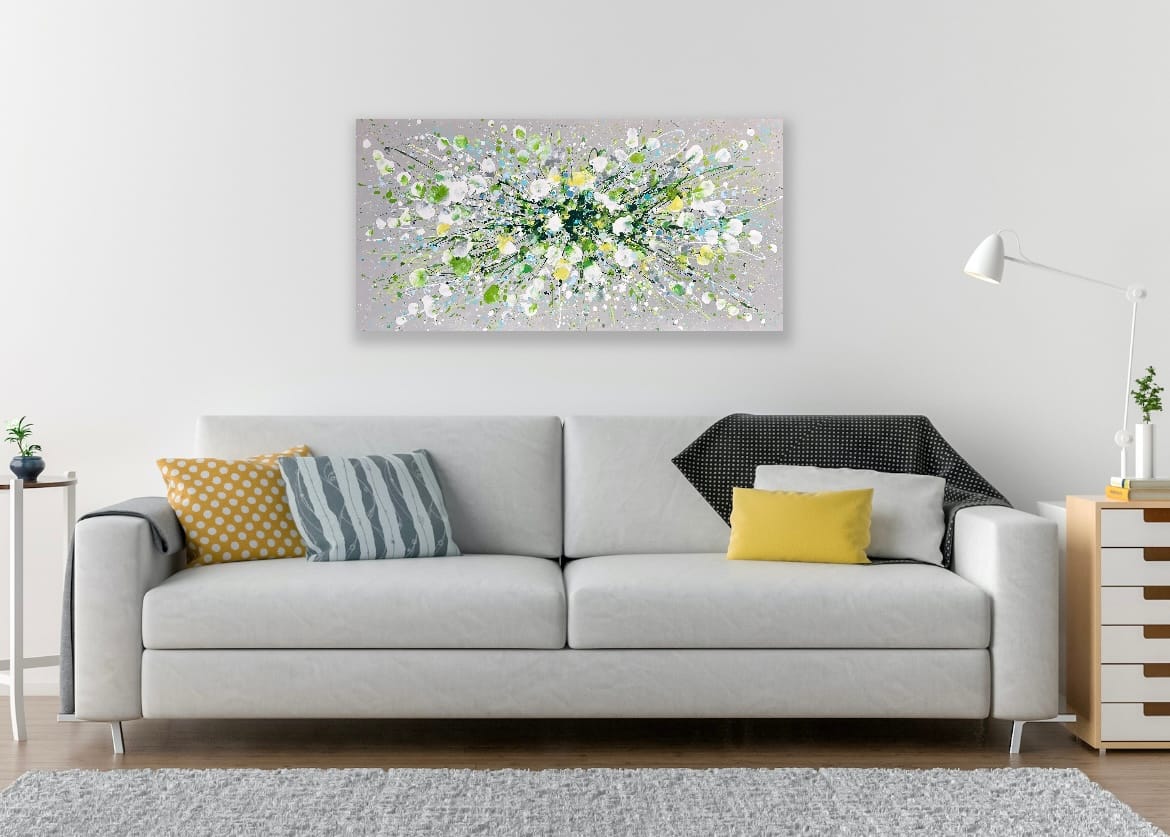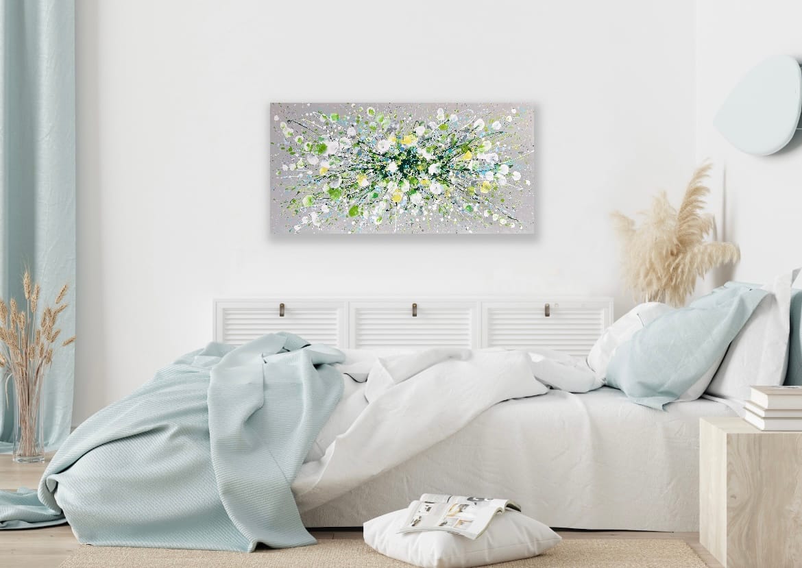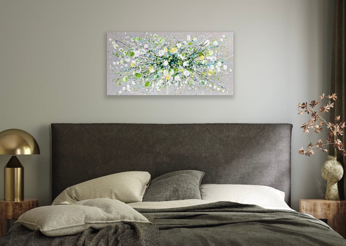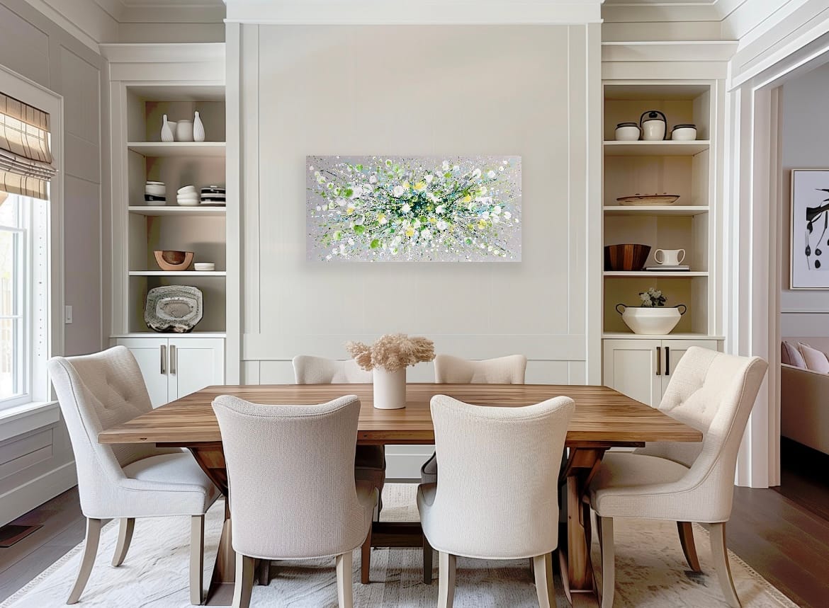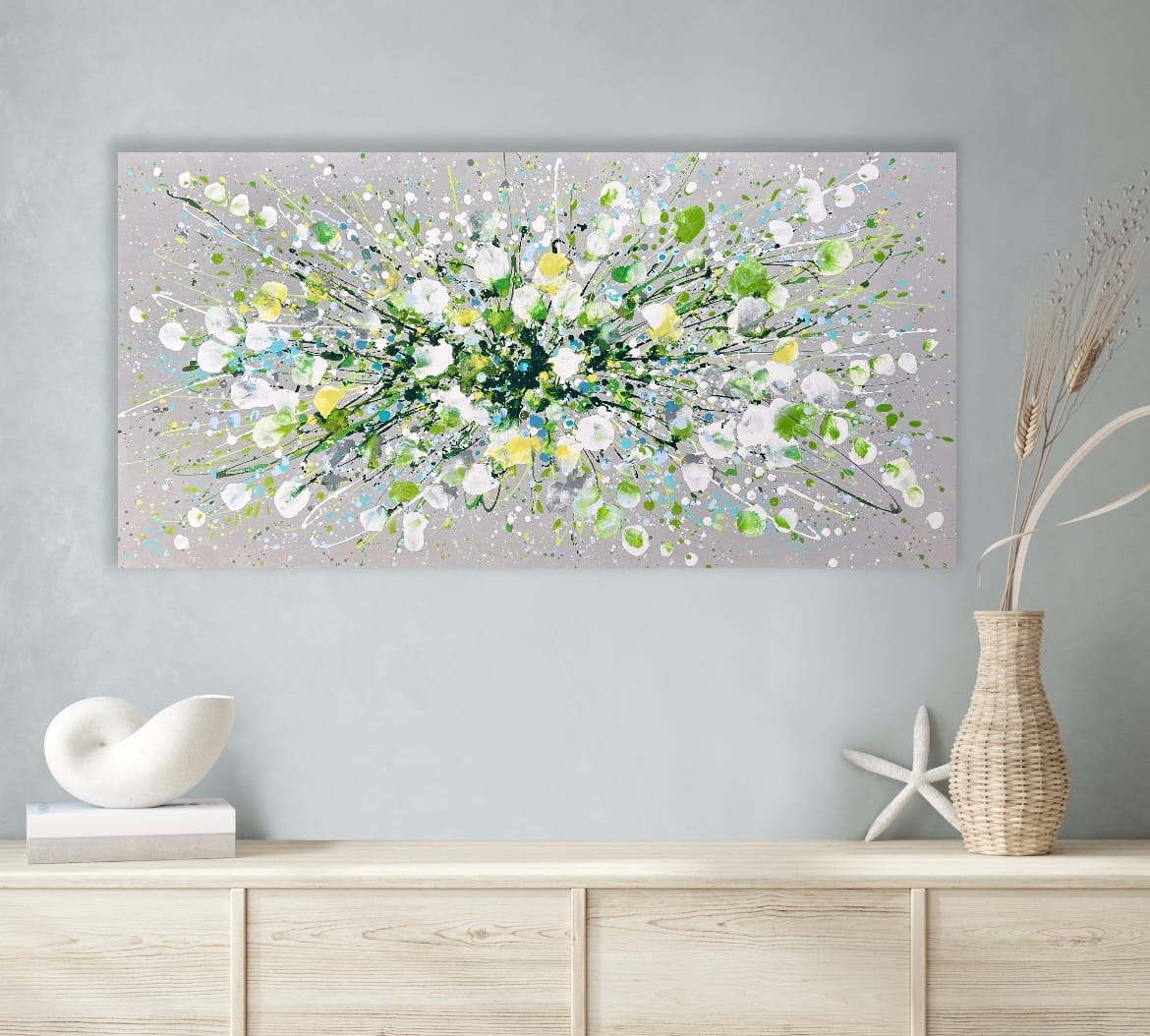 Silver Serenity is a soothing original acrylic painting measuring 100 x 50 x 4 cm. With delicate layers of pearl-like whites, soft greens and cool blues flowing across a silver-grey background, this artwork evokes the gentle movement of water and the quiet beauty of nature’s calmest moments. Its luminous textures and fluid composition bring a sense of peace, grace and balance, making it an uplifting yet tranquil centrepiece for any space.