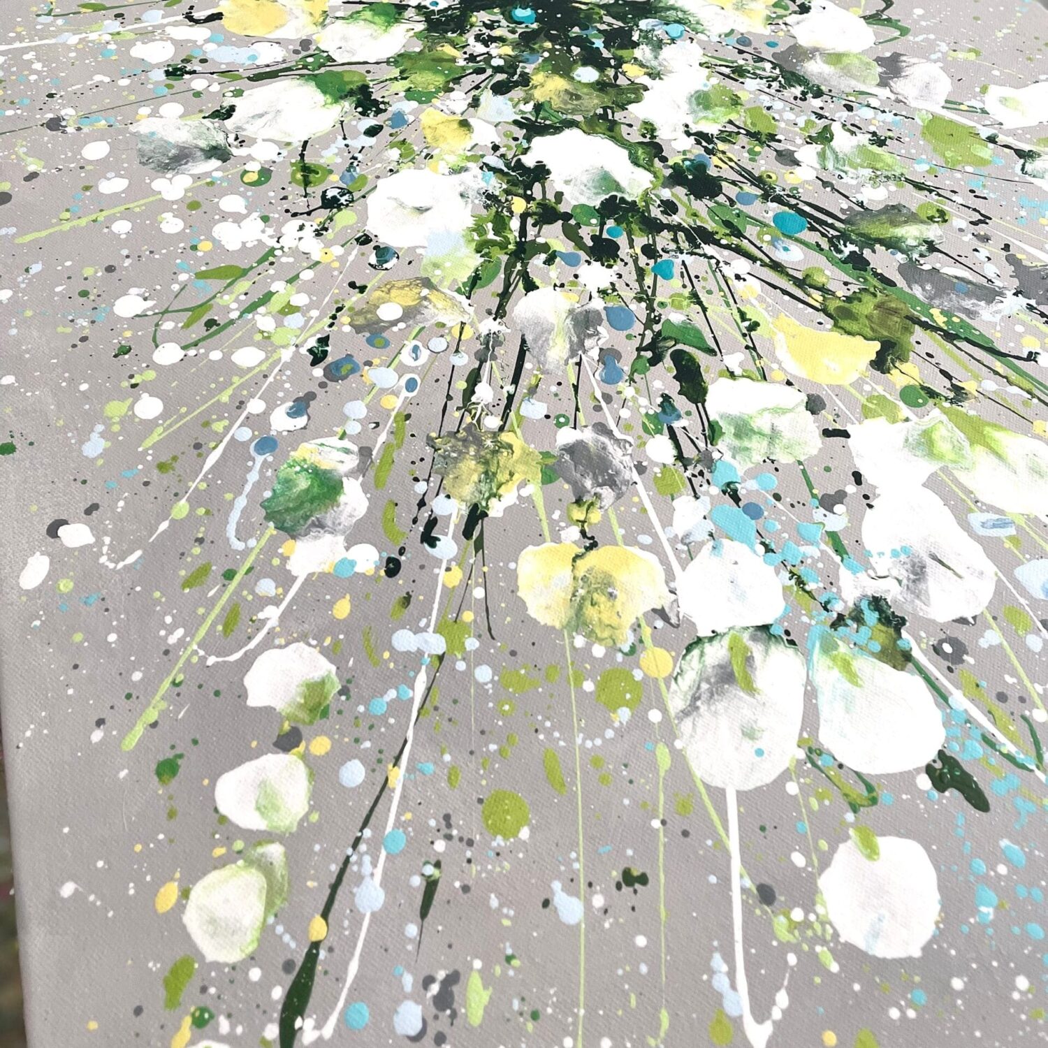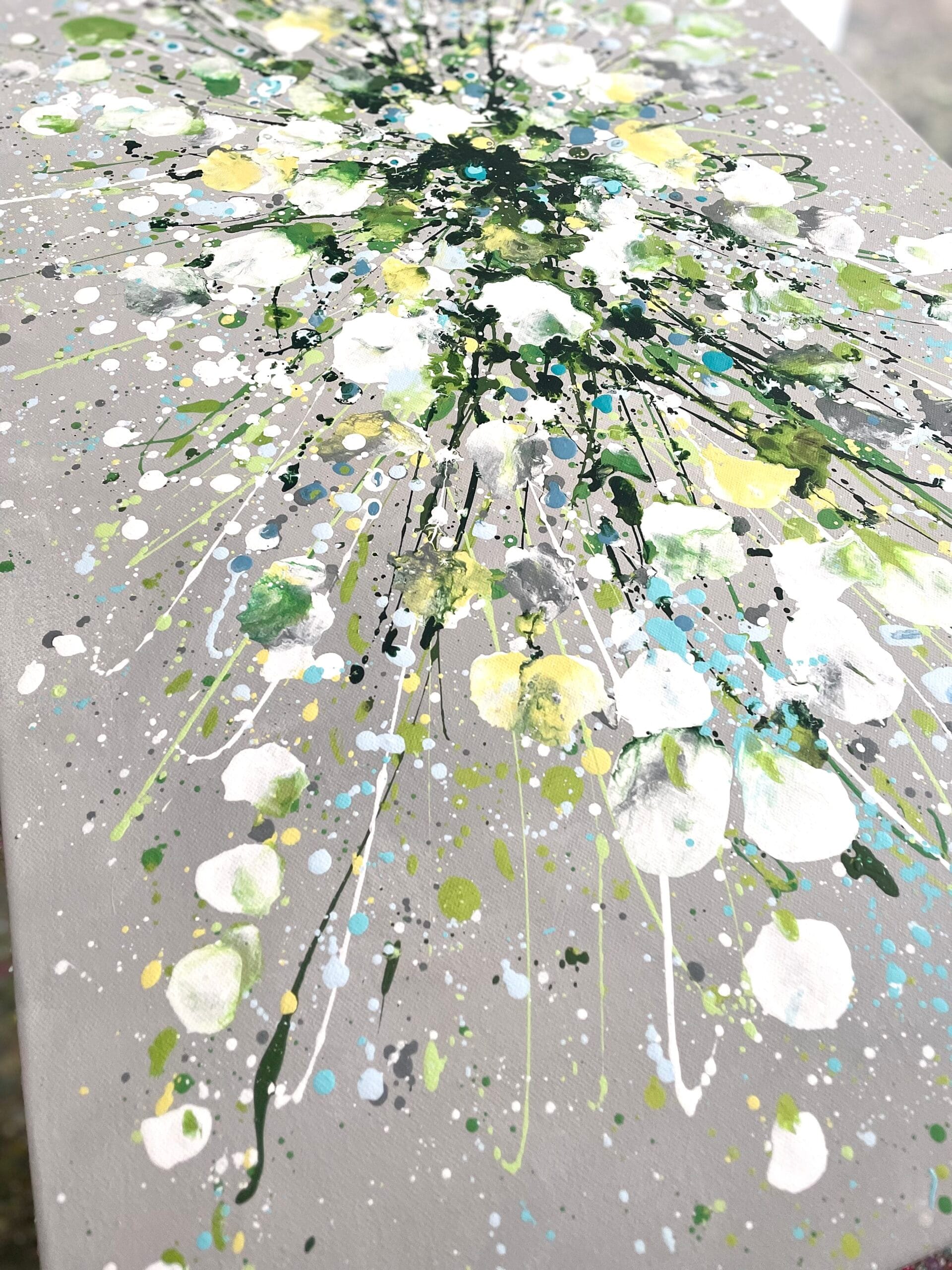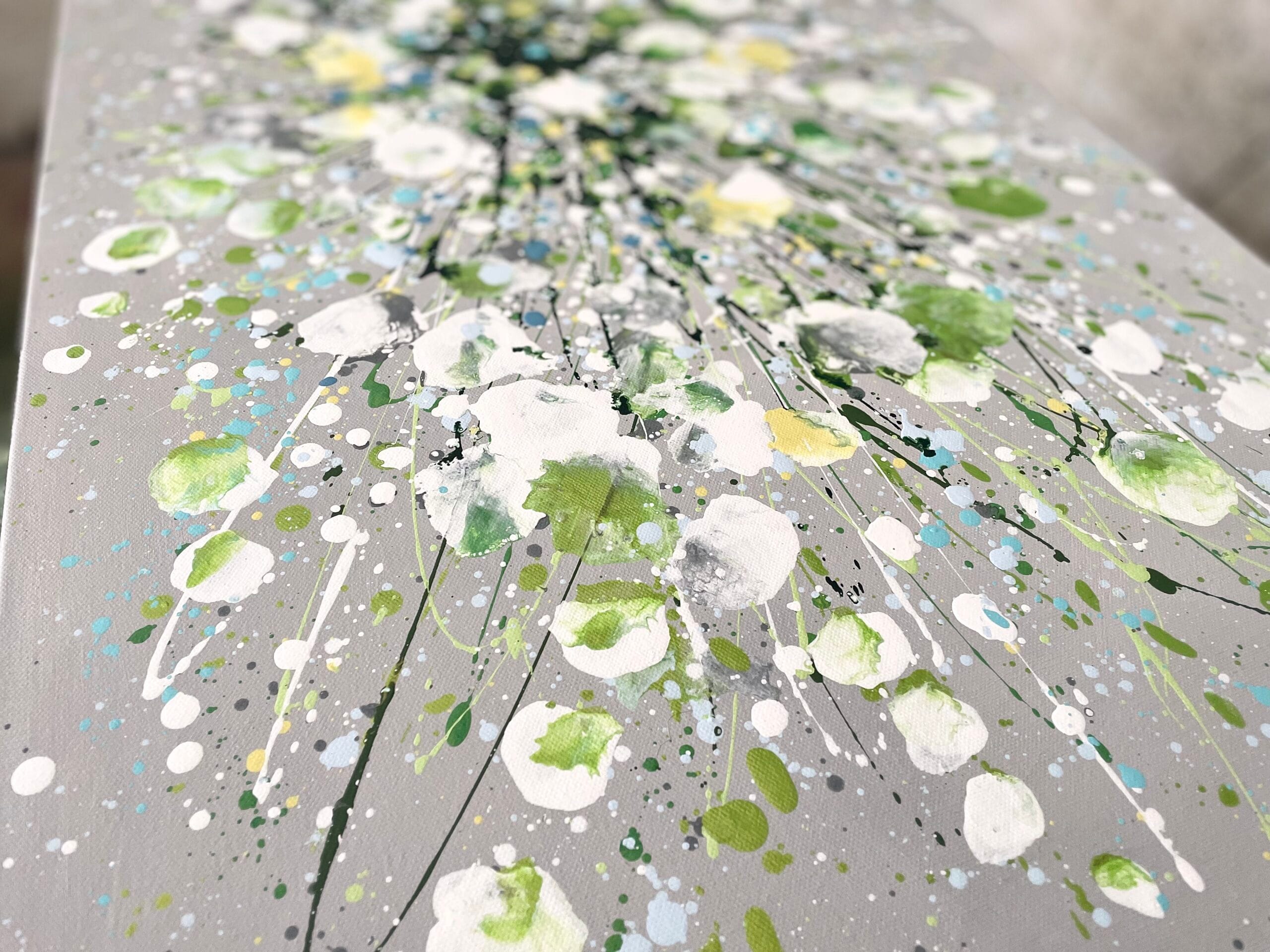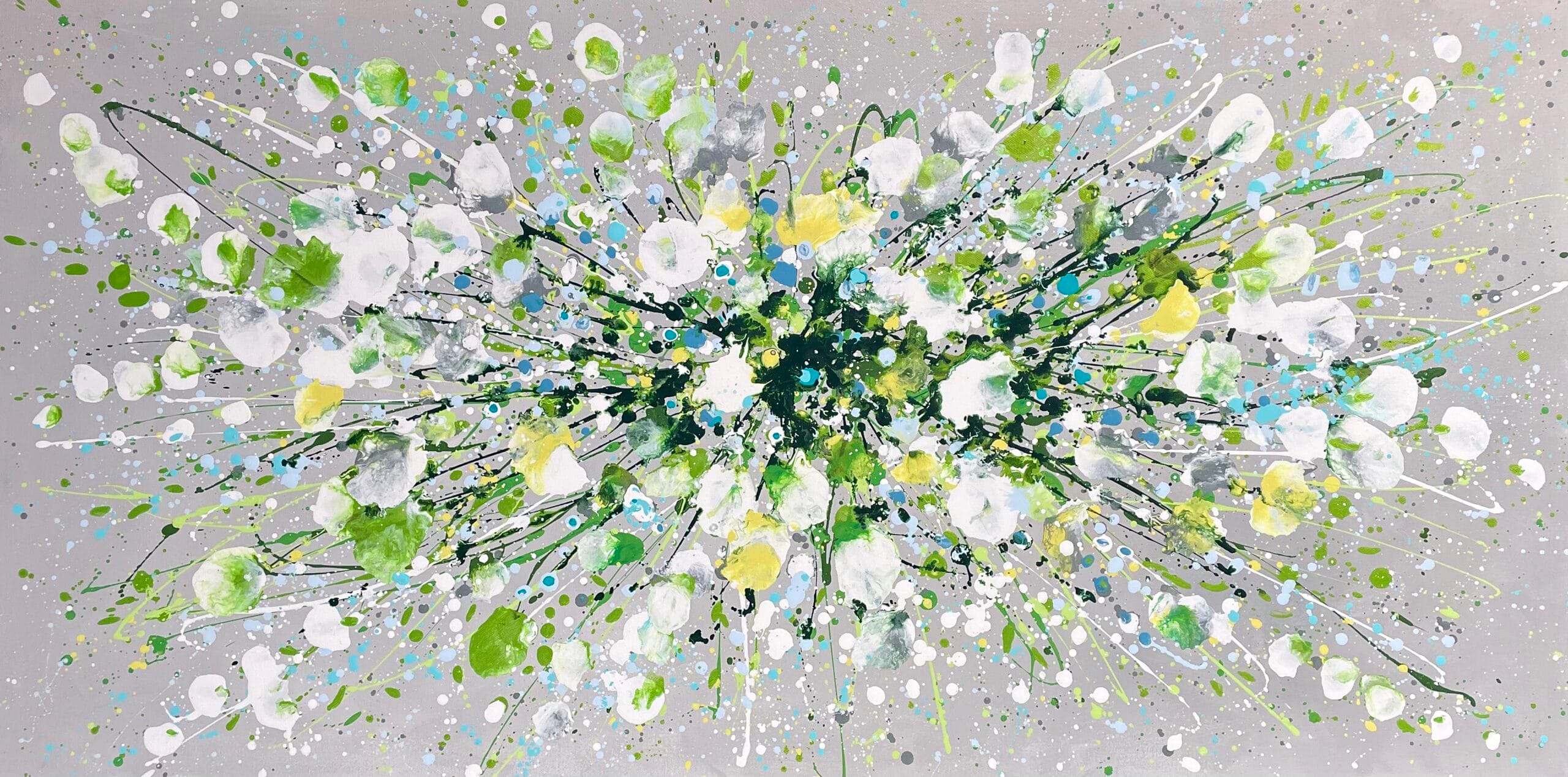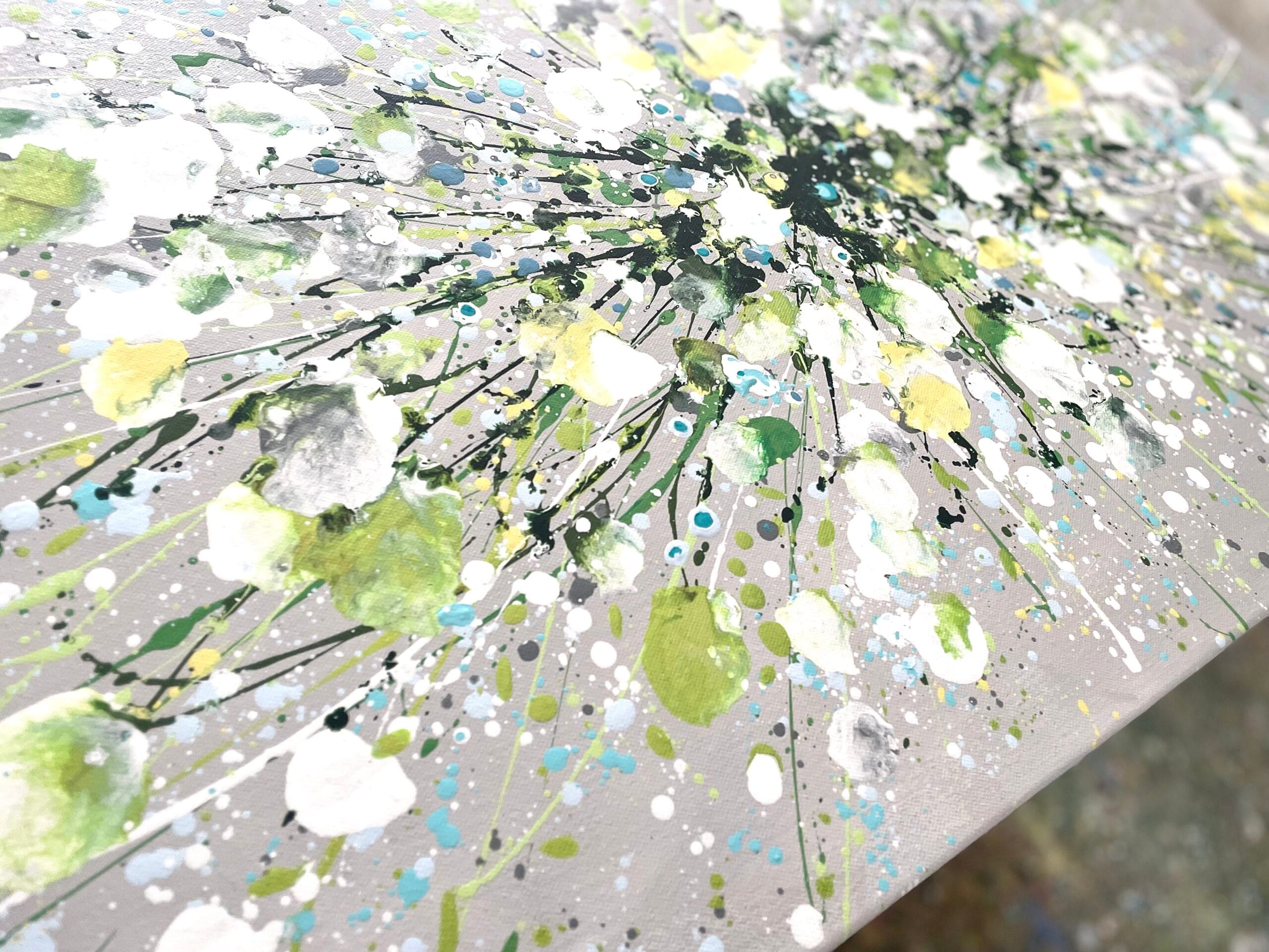 Silver Serenity is a soothing original acrylic painting measuring 100 x 50 x 4 cm. With delicate layers of pearl-like whites, soft greens and cool blues flowing across a silver-grey background, this artwork evokes the gentle movement of water and the quiet beauty of nature’s calmest moments. Its luminous textures and fluid composition bring a sense of peace, grace and balance, making it an uplifting yet tranquil centrepiece for any space.