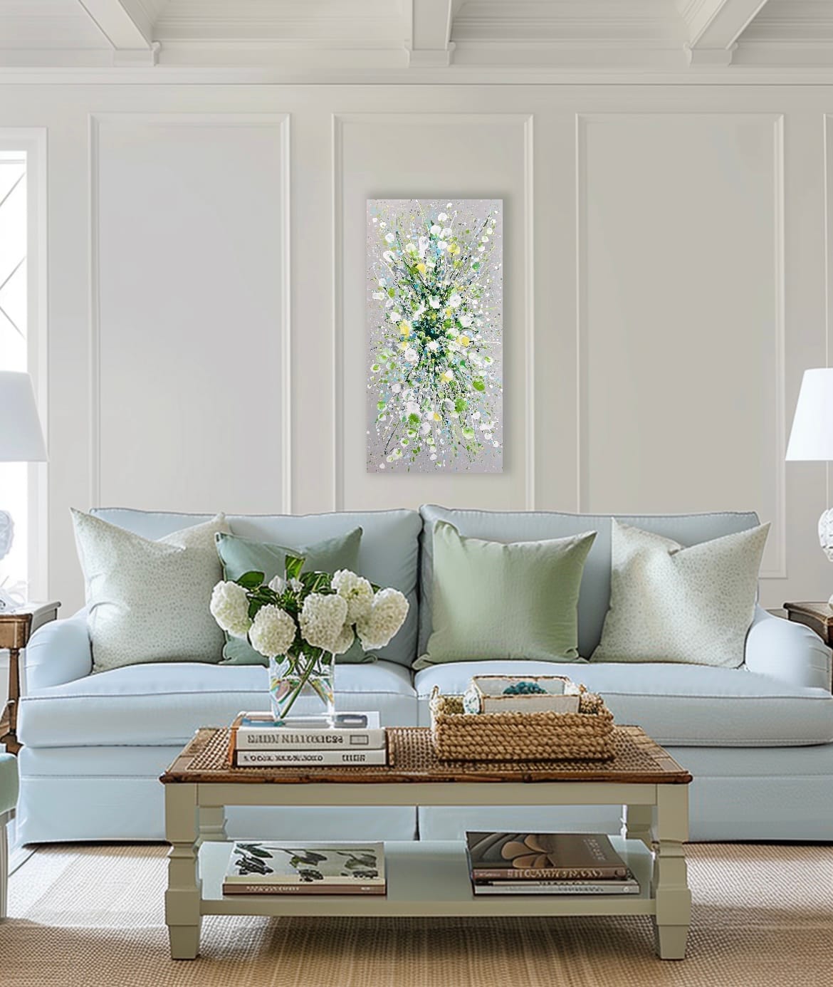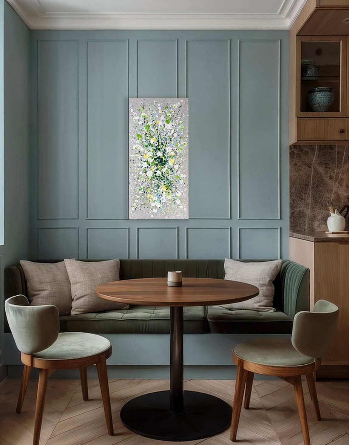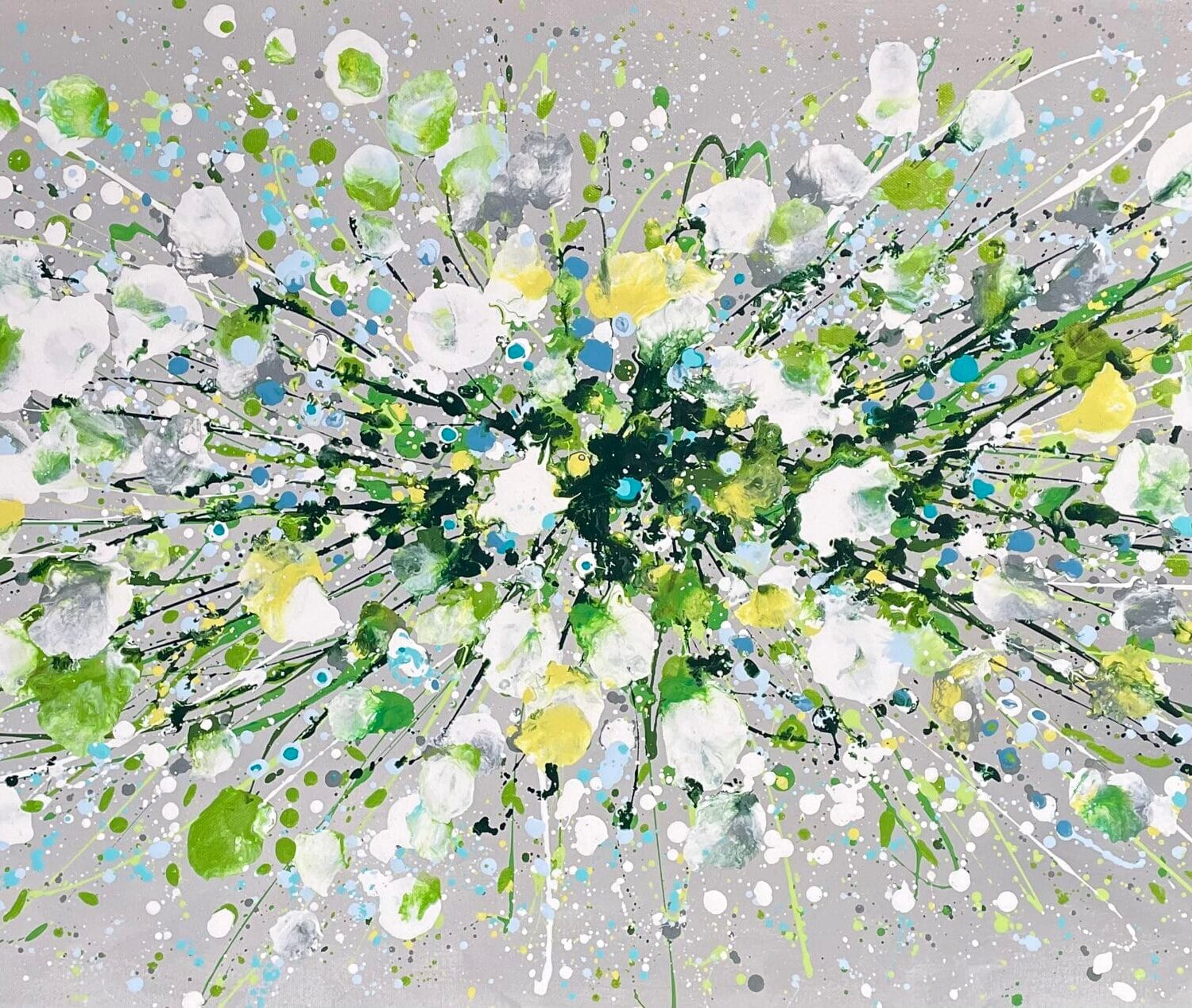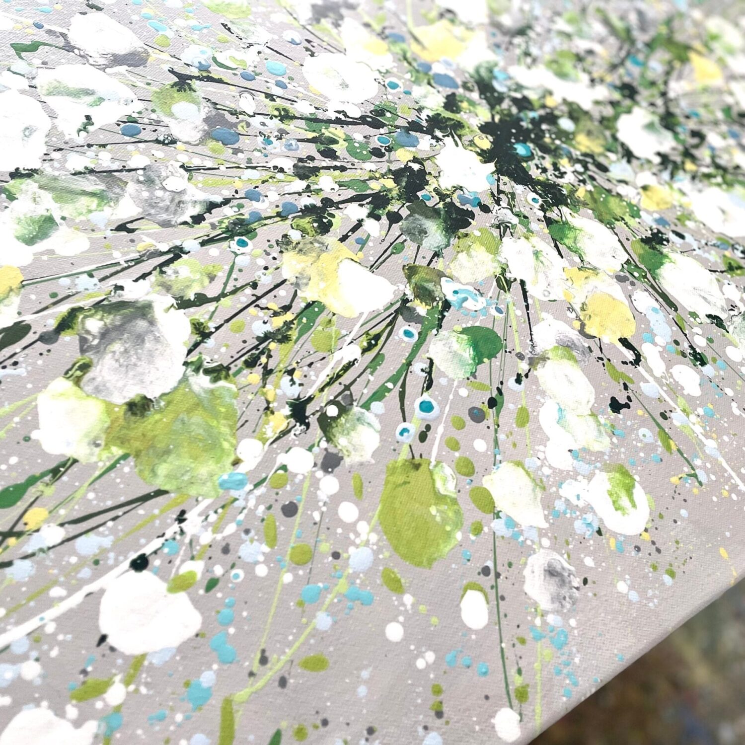 Silver Serenity is a soothing original acrylic painting measuring 100 x 50 x 4 cm. With delicate layers of pearl-like whites, soft greens and cool blues flowing across a silver-grey background, this artwork evokes the gentle movement of water and the quiet beauty of nature’s calmest moments. Its luminous textures and fluid composition bring a sense of peace, grace and balance, making it an uplifting yet tranquil centrepiece for any space.