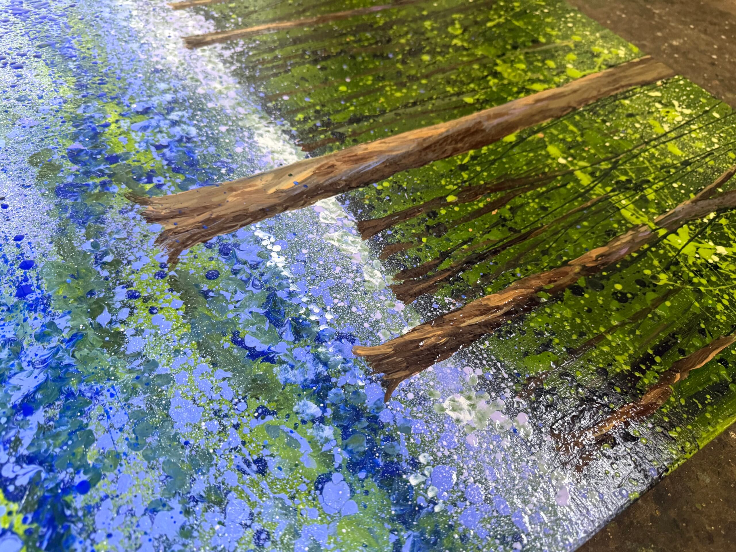 Painted in rich layers of traditional oil on canvas, the surface holds a depth and softness that allows the light to move across the painting throughout the day. The interplay of soft blues, fresh greens and warm highlights creates a sense of calm, space and quiet immersion.