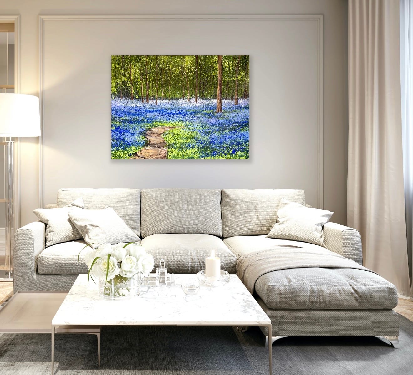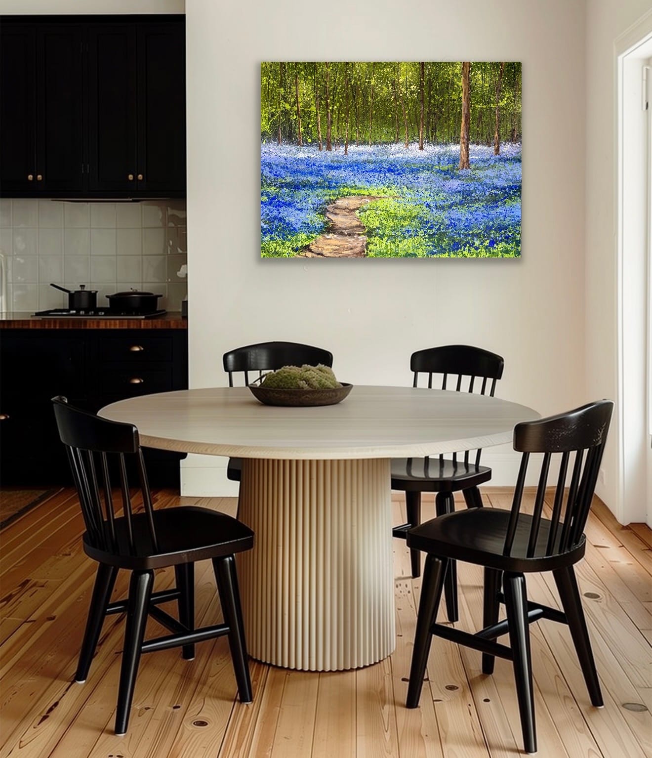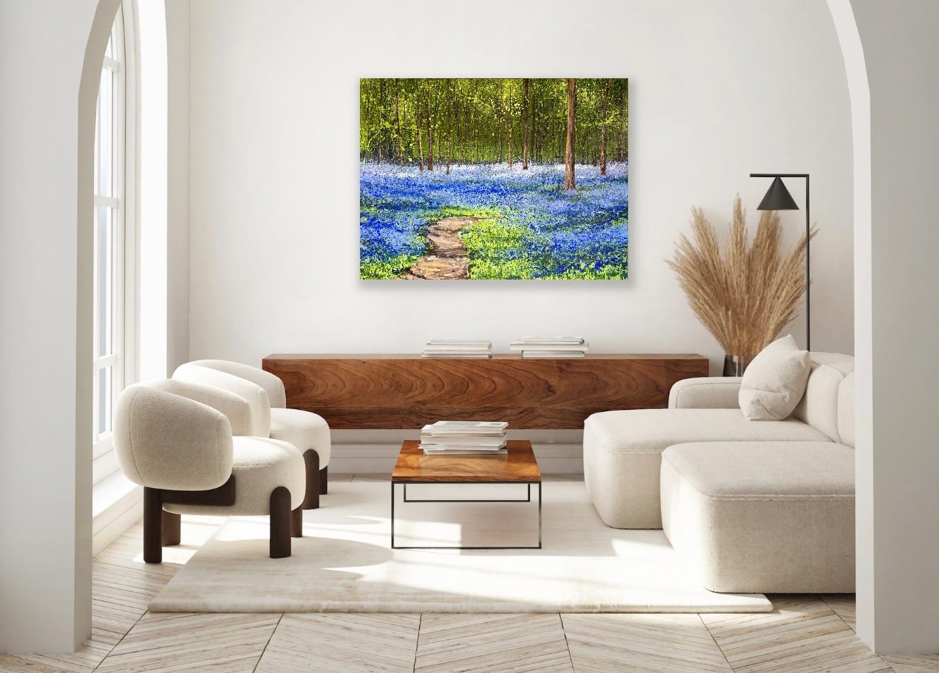 A winding path leads gently through a woodland carpeted in luminous bluebells, where dappled light filters through slender trees and settles across the forest floor. Spring Bluebells captures that fleeting moment when the woods feel quietly enchanted, alive with colour yet wrapped in stillness.