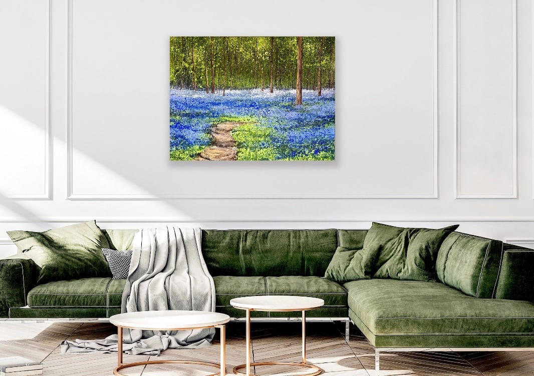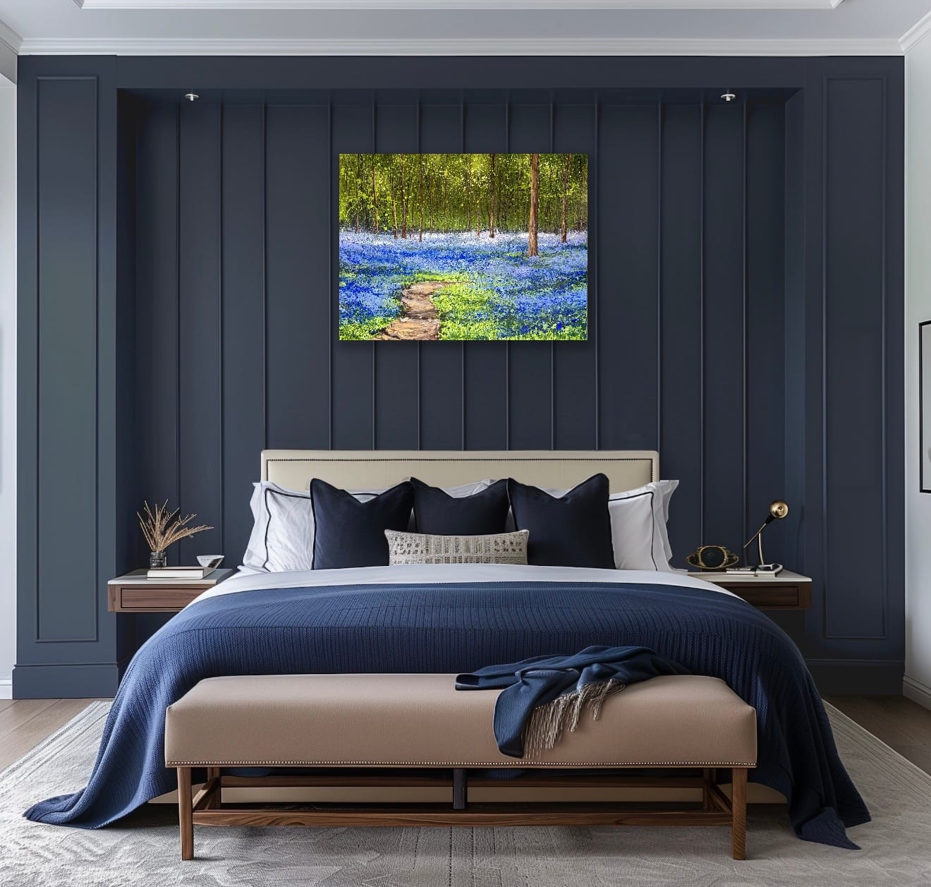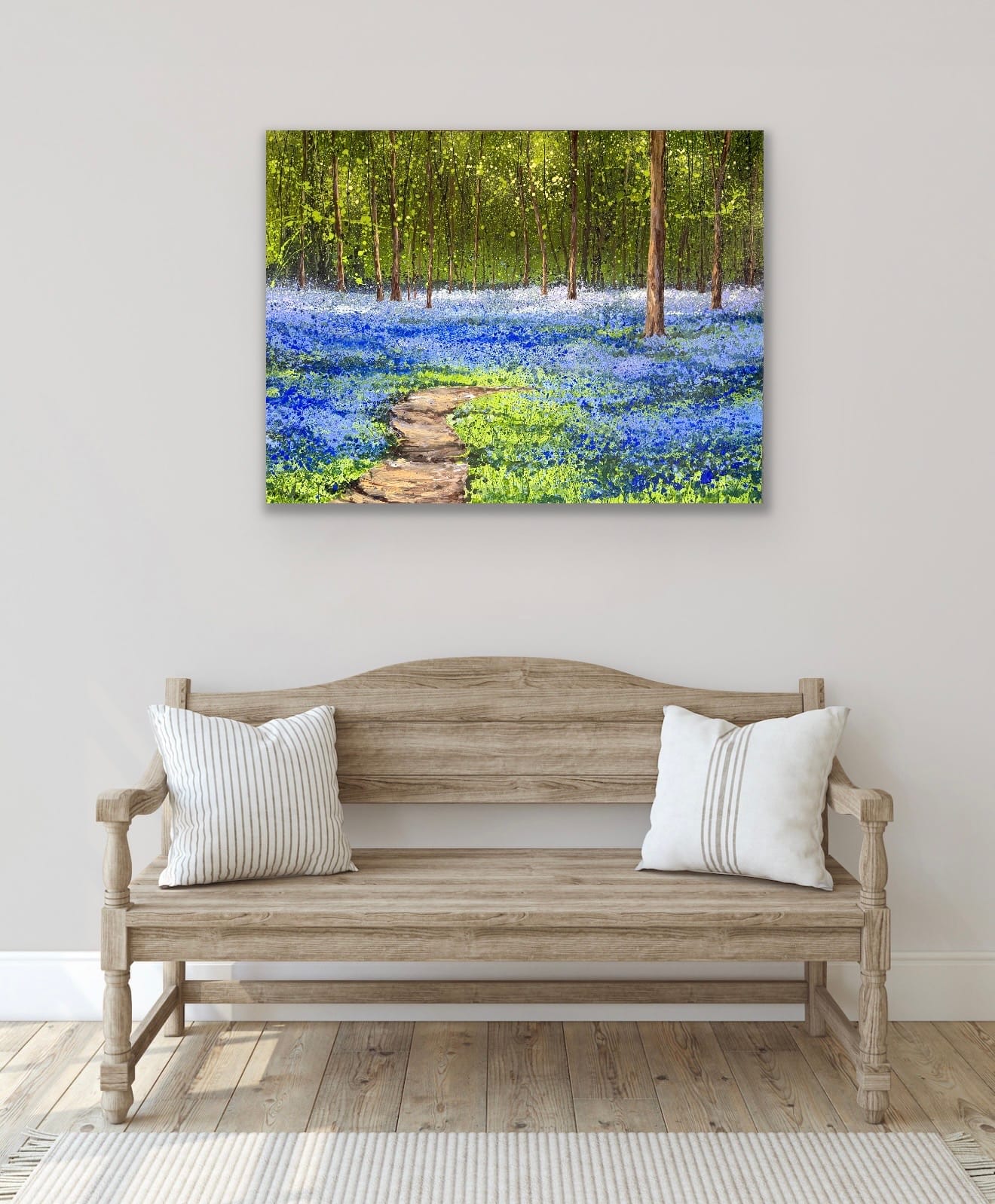 A winding path leads gently through a woodland carpeted in luminous bluebells, where dappled light filters through slender trees and settles across the forest floor. Spring Bluebells captures that fleeting moment when the woods feel quietly enchanted, alive with colour yet wrapped in stillness.