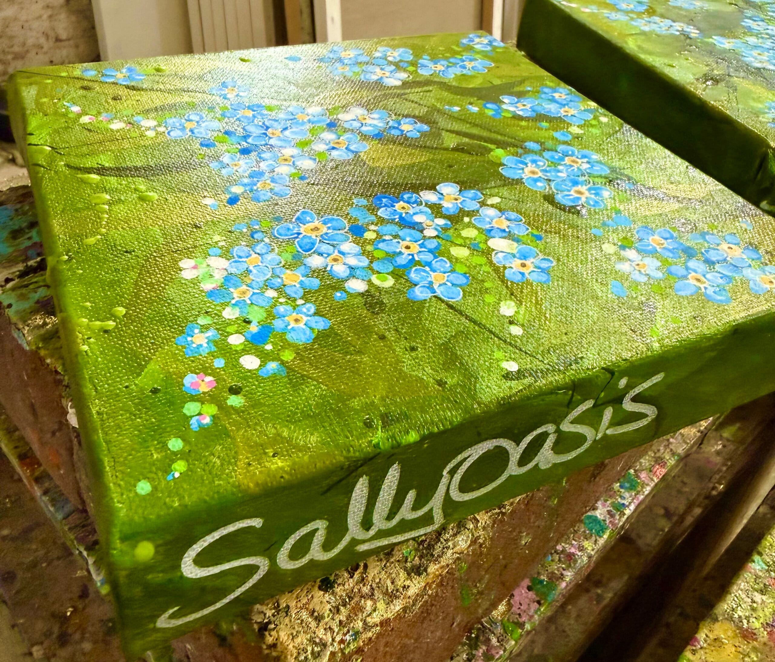 This forget me not flower painting, titled Sweet Forget Me Nots, is a joyful contemporary impressionist artwork inspired by the delicate beauty of spring wildflowers.