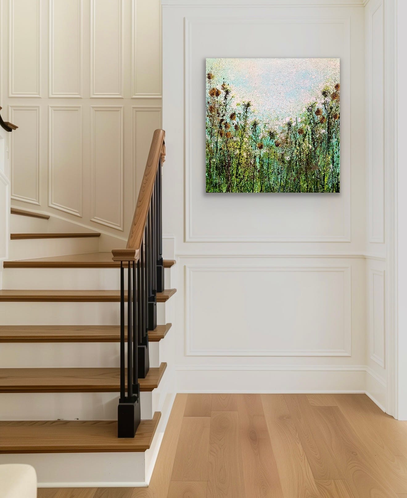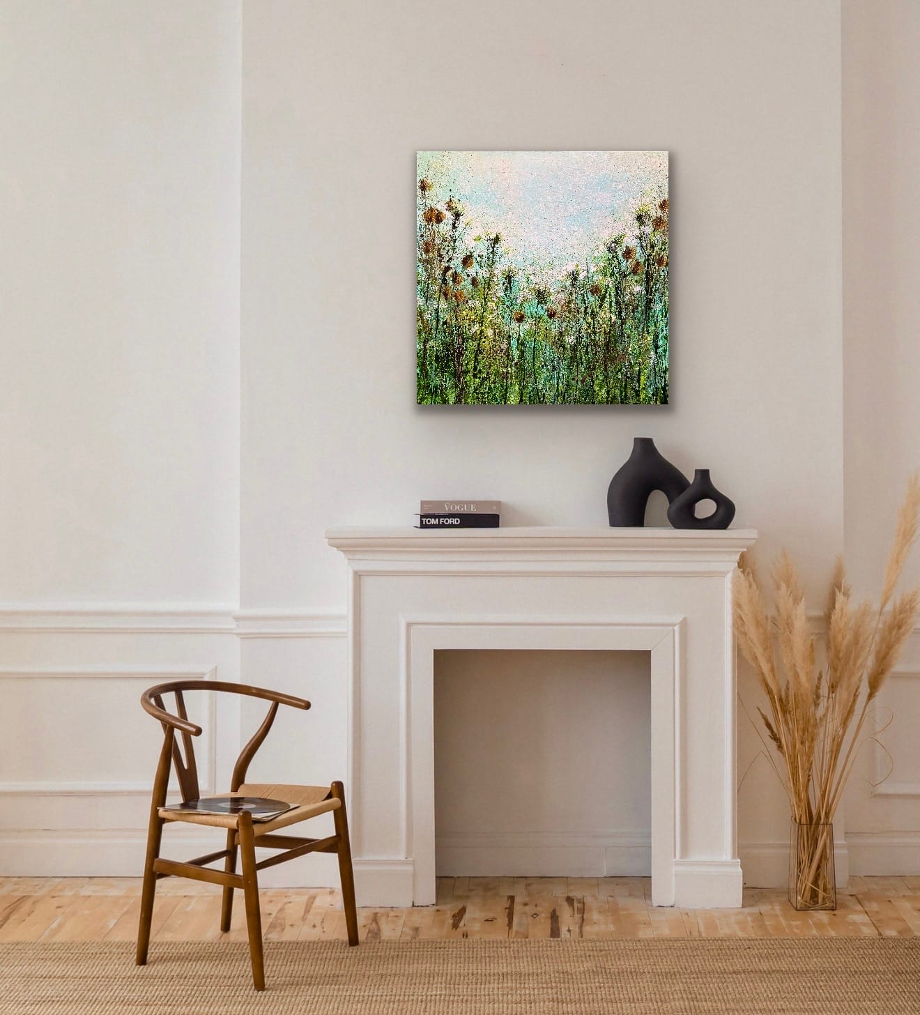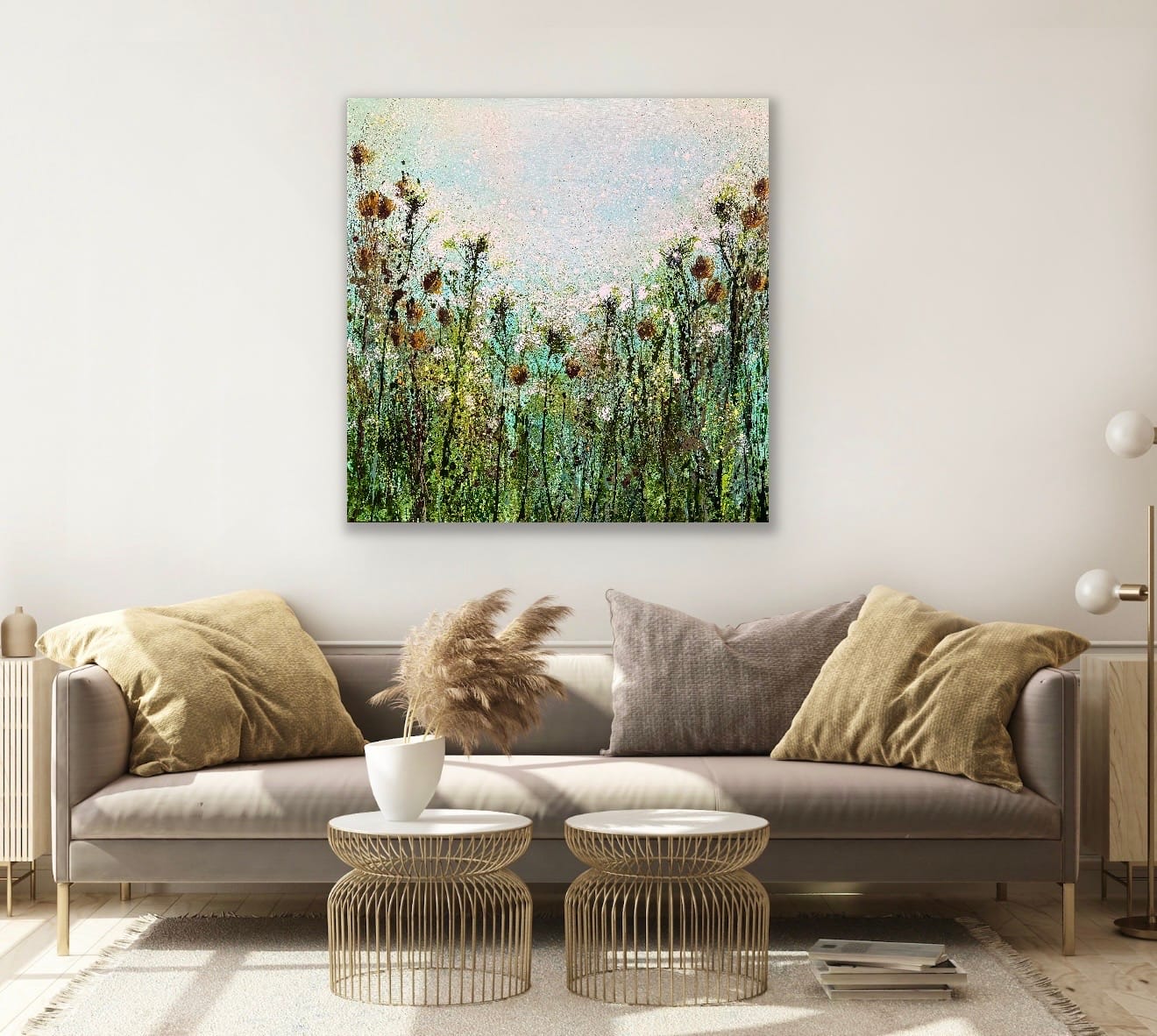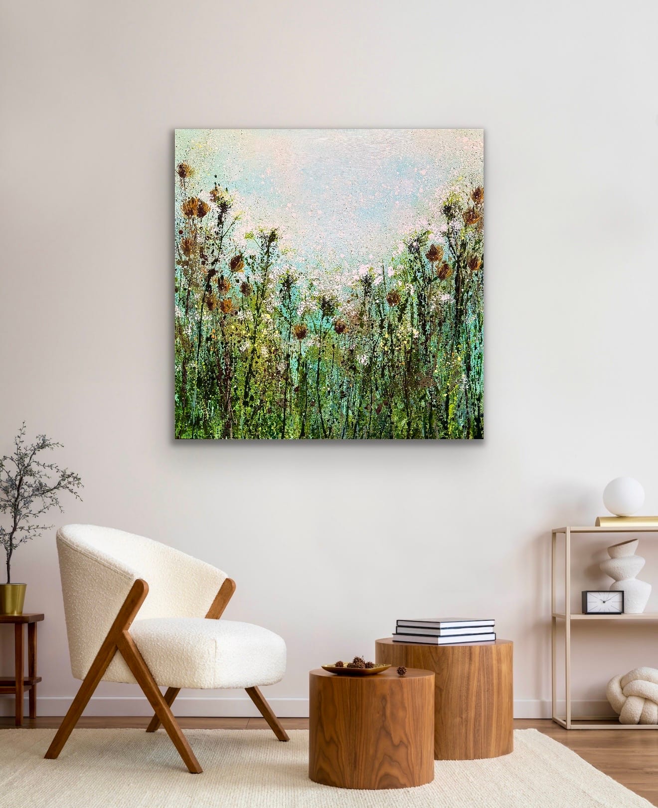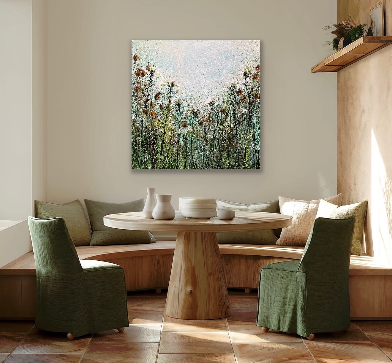 This large square painting brings a feeling of openness and stillness to an interior. Equally suited to contemporary or classic settings, it offers a gentle connection to nature and the rhythms of the countryside. The deep canvas edges allow the work to be displayed unframed for a clean, modern finish.