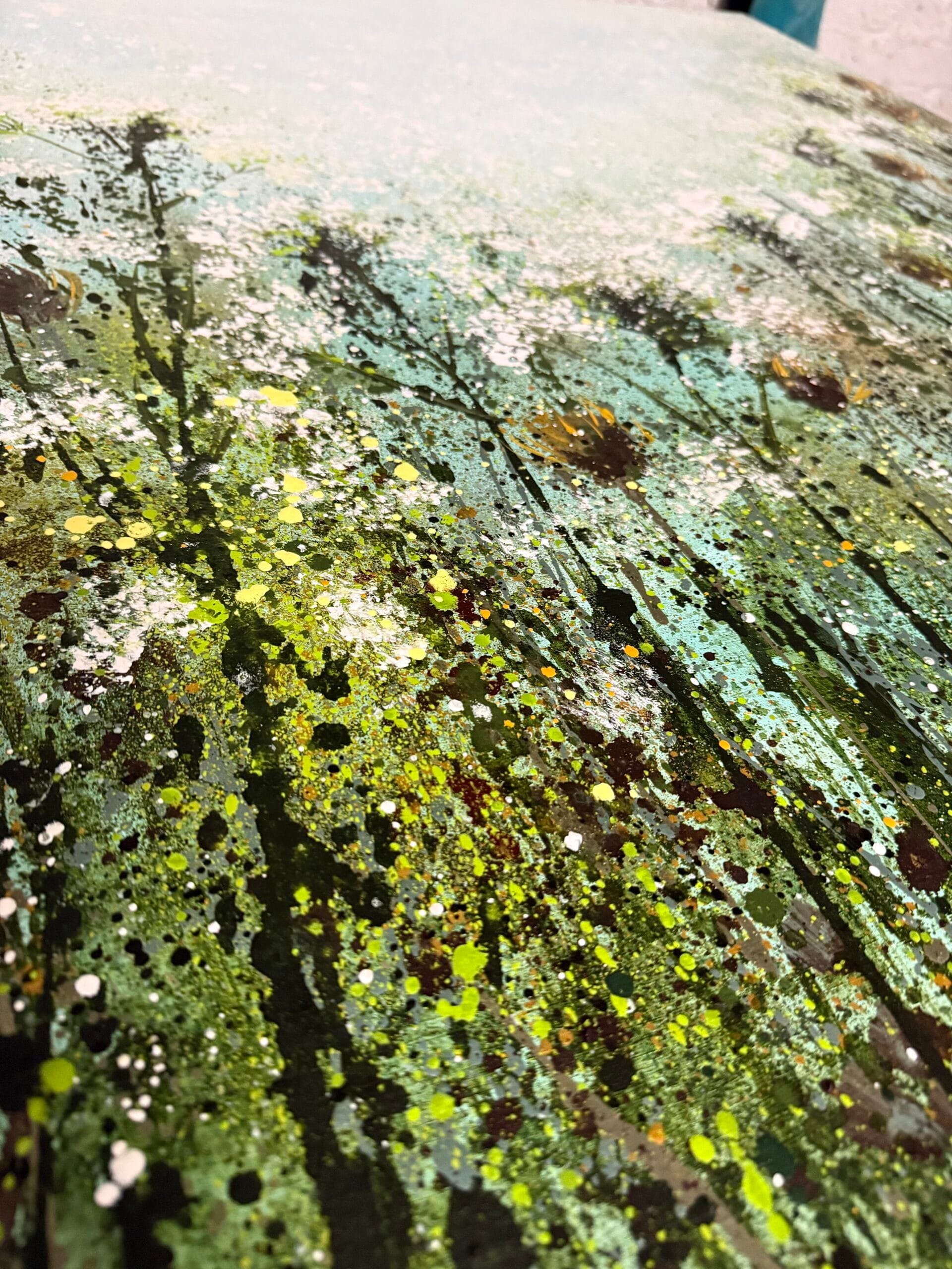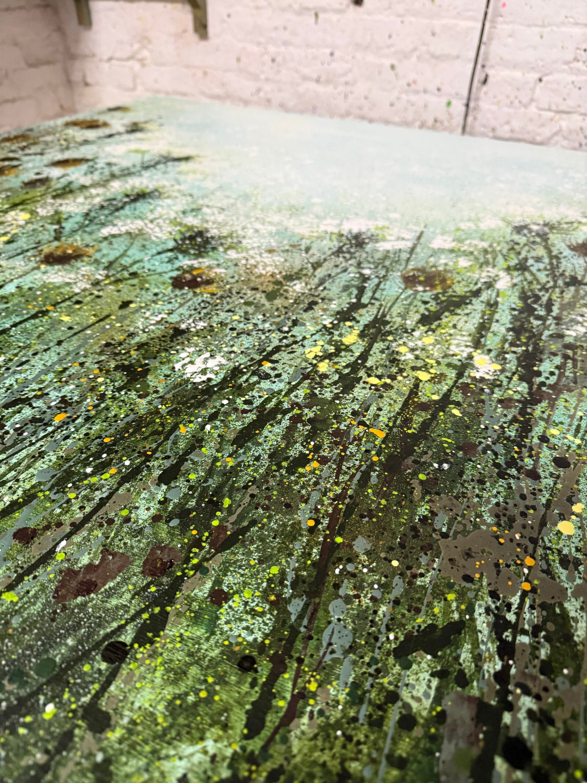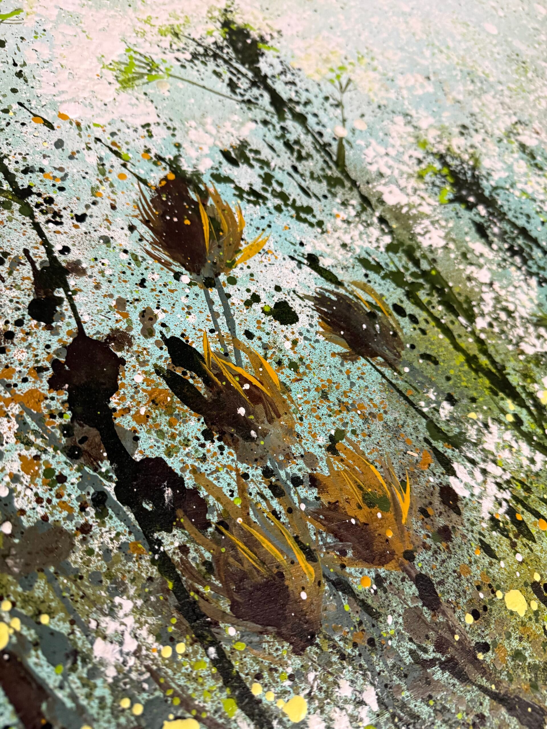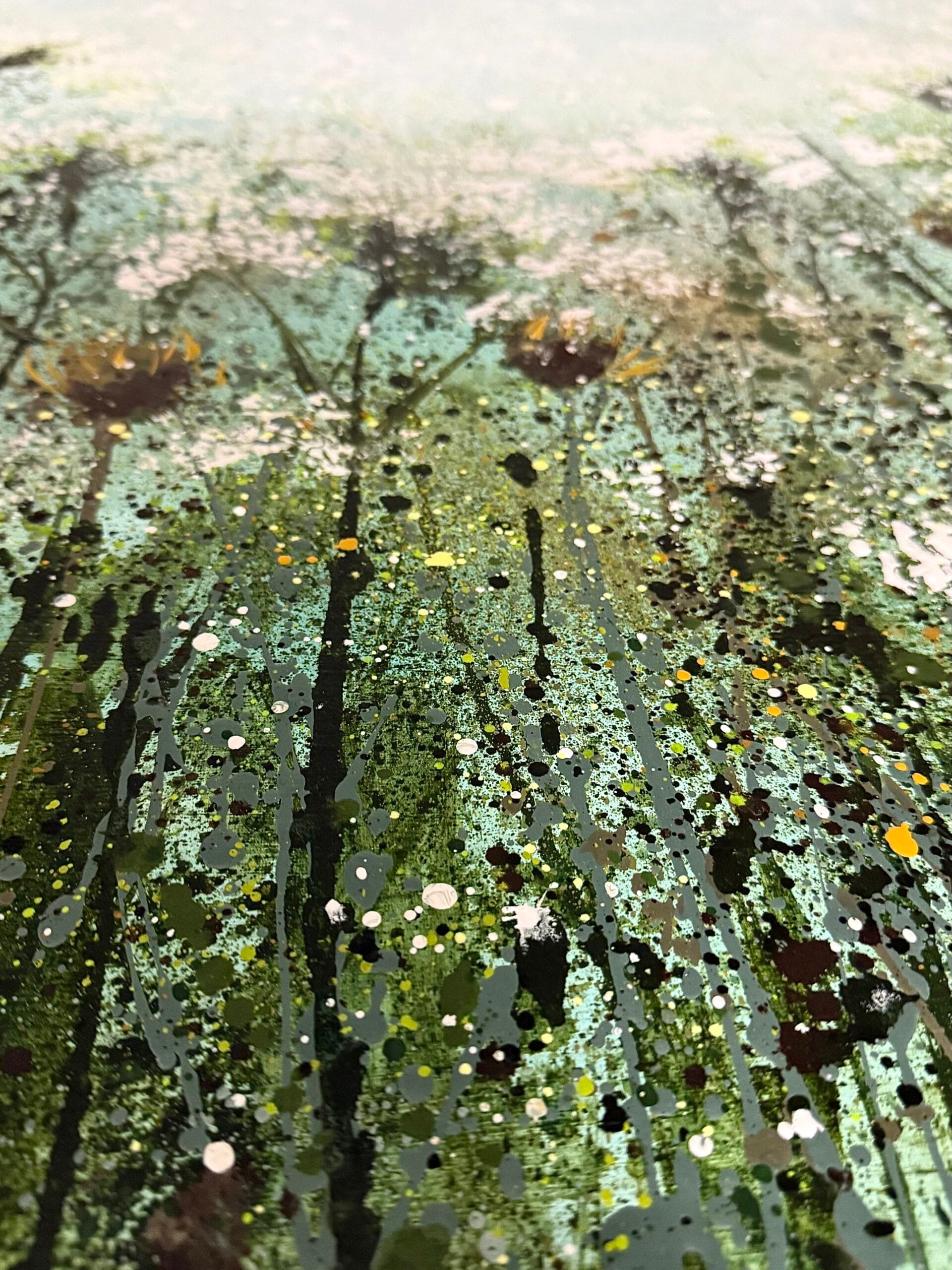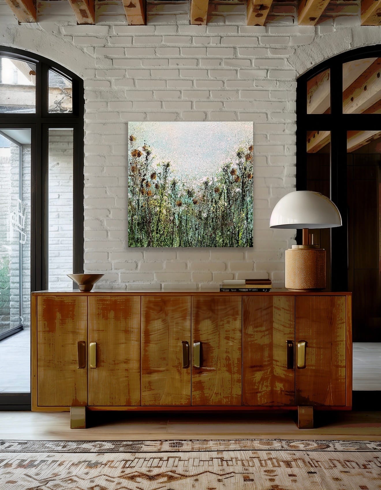 Built through layered oil paint and expressive mark-making, the surface carries a sense of movement and depth, evoking grasses shifting lightly in a summer breeze. A restrained palette of sage greens, muted turquoise, soft creams and earthy browns creates a calm, restorative presence, inviting the eye to wander and settle.